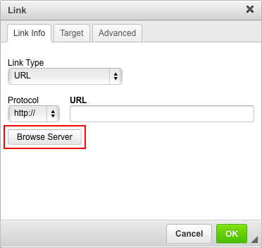 - Highlight the text and click the “Insert/ Edit Link” button (chain with a green plus sign). A popup window will appear.