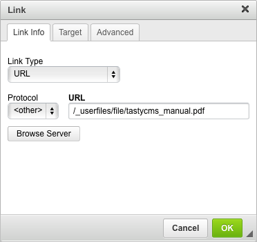 - The large popup window will close and the correct link will appear in the “URL” text box.