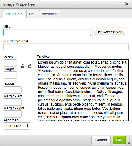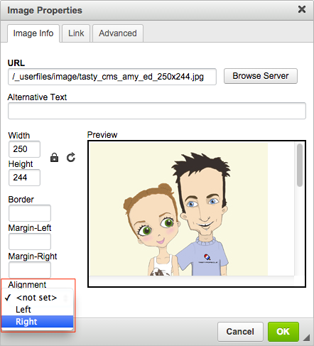 WARNING: Please do NOT upload image files that exceed 1mb. - To allow text to wrap around the image select the "Alignment" - Left or Right. (If you want the image to be on the left side of the content, choose Left. If you want the image to be on the right side of the content, choose right.)