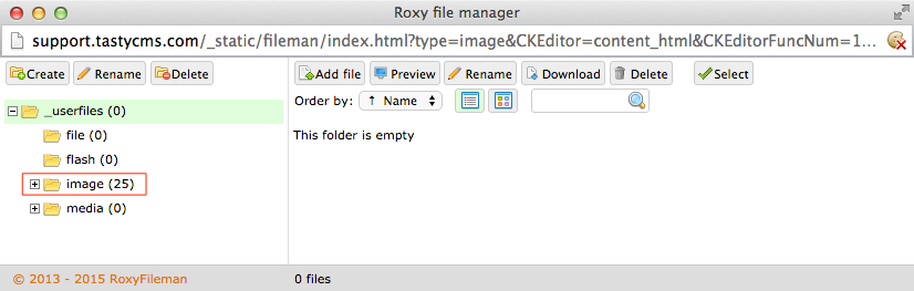 - A larger pop-up window will appear. In the upper left hand corner, the "_userfiles" directory will automatically be selected. Select the "image" directory.