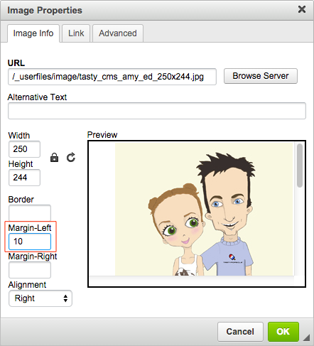 - "Margin-left" & "Margin-right" controls the amount of padding (or pixels) between the text and the image. In the picture example example above, the image is aligned to the right so a number needs to be added into the "Margin-left" field. If an image was aligned to the left, then a number would need to be added to the "Margin-right" field. Typically, a number between 5 and 10 is sufficient.