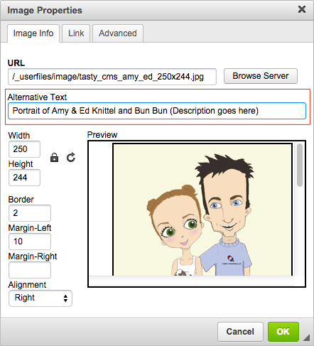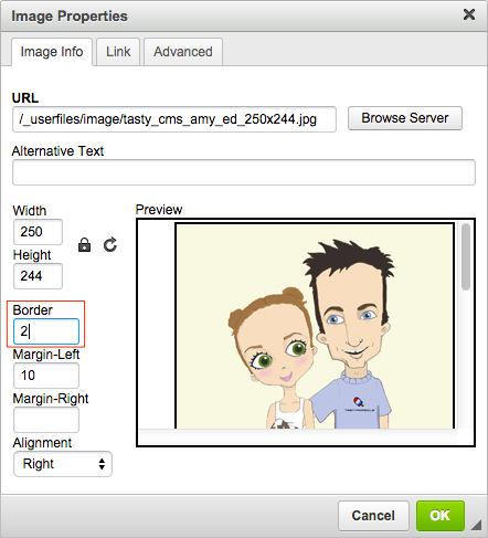 - You have the option of placing a border around the picture. Again, the number represents the amount of pixels that will be added. If you type the number 2 into the border field, the CMS will create a 2 pixel border around the picture.