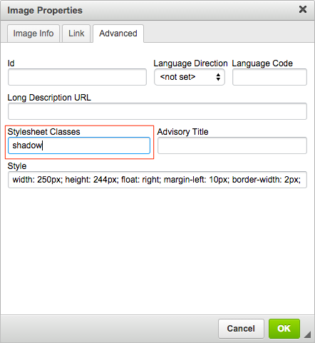 - Click on the "Advanced" tab. Type the word "shadow" in the "Stylesheet Classes" field if you want the image to have a drop a shadow.