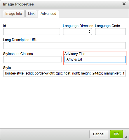 - "Advisory Title" - If you want text to appear when a cursor hovers over the image, then type in a title for the image here.