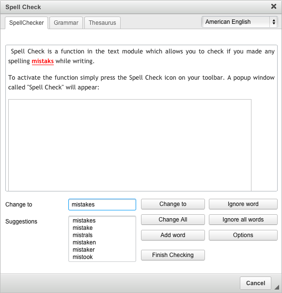 Spell Check is a function in the text module which allows you to check if you made any spelling mistakes while writing.