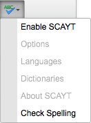 An additional option under the Spell Check menu is "Enable SCAYT". When you enable Spell Check as You Type the text editor will check your spelling as you write your content. A squiggly red line will appear under any misspelled words. To correct the spelling of these words, right-click on the words and choose the correct spelling.